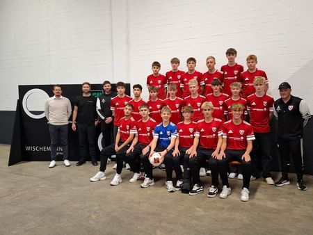 Auf dem Bild: linke Seite v.l.n.r.: Kevin Jarvers (Vertrieb WISCHEMANN, Franjo Lahrkamp (technischer Leiter WISCHEMANN), Dr. Jan Kappelhoff (Nachhaltigkeitsmanager WISCHEMANN und Trainer der B-Jugend), Mitte: 20 echt tolle Jungs der B-Jugend, rechte Seite: Trainer Timo Kappelhoff.