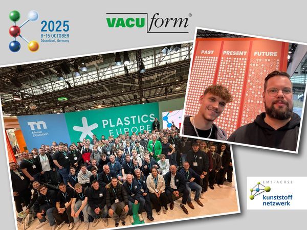 Auf Einladung des Kunststoffnetzwerks Emsachse (vielen Dank!) durften unser Auszubildender Tom Konermann und Projektleiter Thomas Schütz aus der technischen Entwicklung gemeinsam mit vielen anderen Auszubildenden und deren Begleitern die Kunststoffmesse K in Düsseldorf erkunden - mit tollen Gesprächen, spannenden Einblicken in die Zukunft der Branche und einer interessanten Podiumsdiskussion zum Thema Recycling.