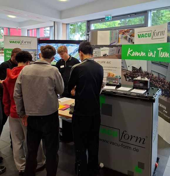 Und wie sieht der Ausbildungsalltag bei VACU-form aus? Diese und viele andere Fragen beantworteten unser Auszubildender Simon Schäfer und unser Ausbilder Marius Sowa den interessierten Schülerinnen und Schülern auf der diesjährigen Top Jobs Ausbildungsmesse in der Oberschule Salzbergen. Einen kleinen Eindruck von unserer Produktion bekamen die Jugendlichen auch anhand der Mini-Tiefziehmaschine, mit der sie sich einen Handyhalter erstellen konnten. Details zu den Ausbildungen, einen Film von Azubis für Azubis und viele weitere Infos gibt es auch auf www.werdewischemann.de.