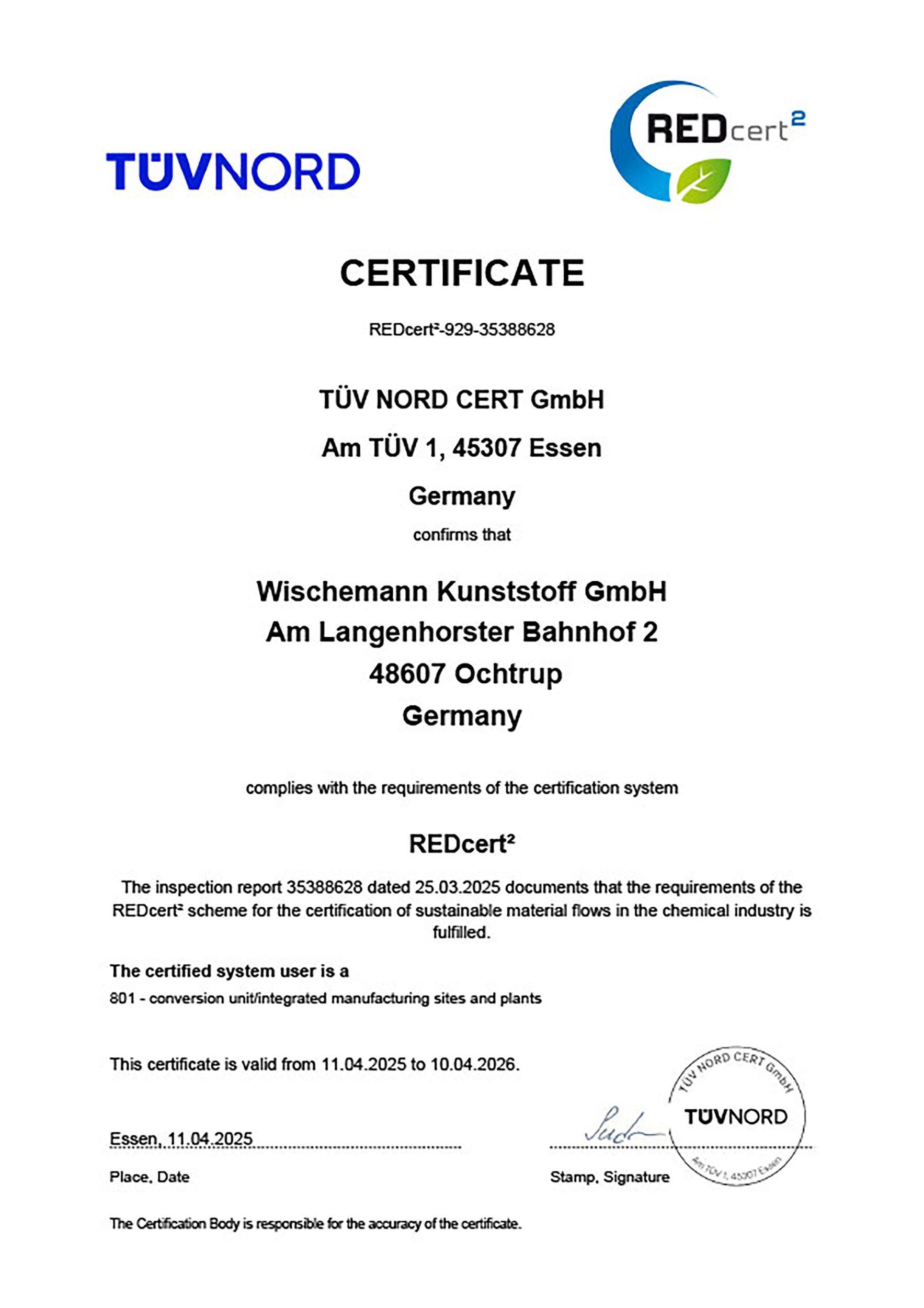 Ressourcenschonung und Klimaschutz prägen schon lange unseren Weg, mit dem REDcert²-Zertifikat, ausgestellt vom TÜV Nord, gehen wir nun noch einen Schritt weiter.